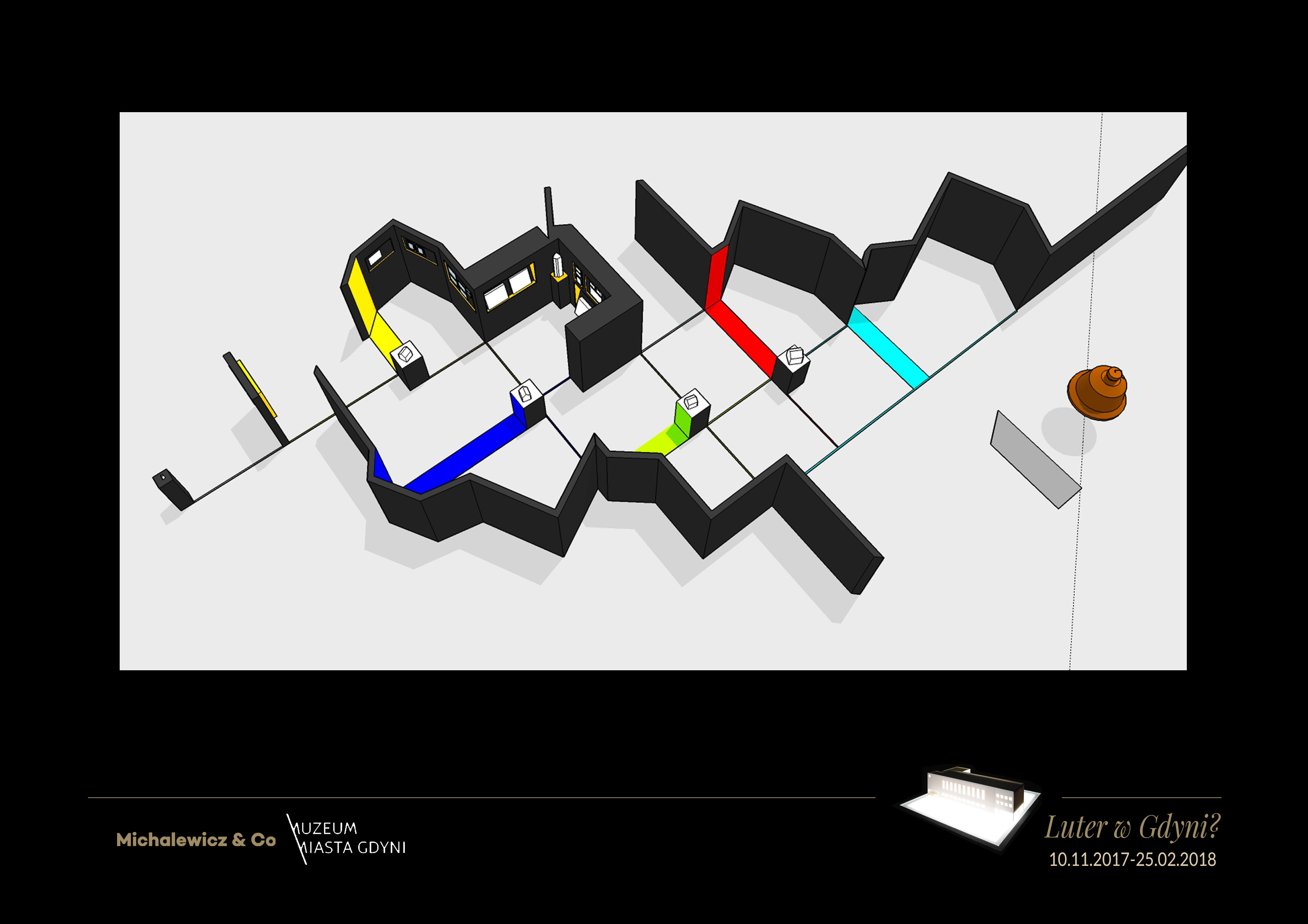 Głównym celem projektantów było podkreślenie i uczytelnienie kompozycji wystawy, na którą składa się 5 galerii, poświęconych różnym okresom dziejów Gdyni i w wchodzących w jej skład miejscowości. Centralnym elementem każdej galerii jest umieszczona na postumencie makieta architektoniczna związanej z nią protestanckiej świątyni, od której, w kierunku ścianek ekspozycyjnych, wiedzie pas w odmiennym kolorze. Kolor ten występuje w innych elementach scenografii – na ściance z tekstem wprowadzającym i na glifach wnęk ekspozycyjnych – oraz, za pomocą linii na podłodze, wyznacza przestrzeń każdej galerii, cały czas informując zwiedzającego, jaką część wystawy aktualnie zwiedza.